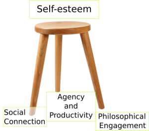 But if I say that self-esteem is the “seat” of a stool with three legs, you can immediately get a sense of what it comprises and how the parts relate and interact. And if we name the three “legs,” social connection, agency and productivity, and philosophical/spiritual/religious engagement, the picture becomes even clearer.